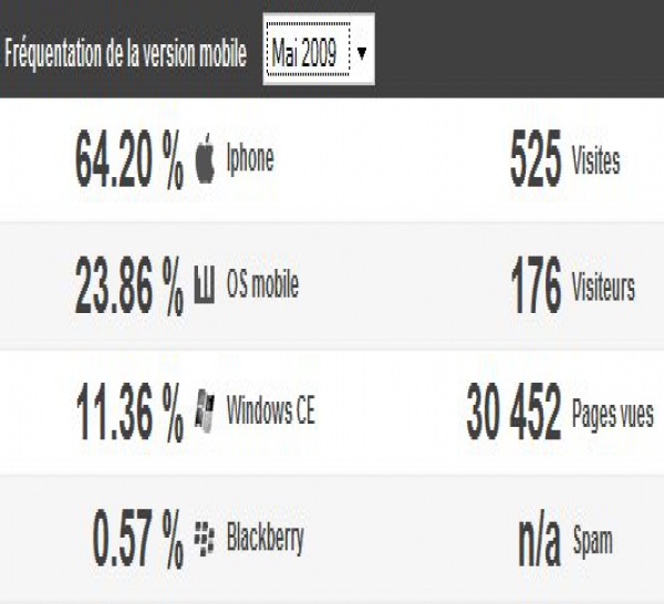 Des nouvelles stats mobiles sont disponibles. Vous pouvez analyser la consultation de la version mobile de votre site au niveau :- des visites- des visiteurs- des pages vuesUn tableau récapitulatif agrège les informations sur le mois en cours.Il permet aussi de connaitre à partir de quel terminal...
